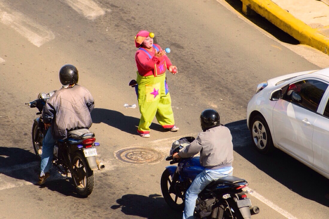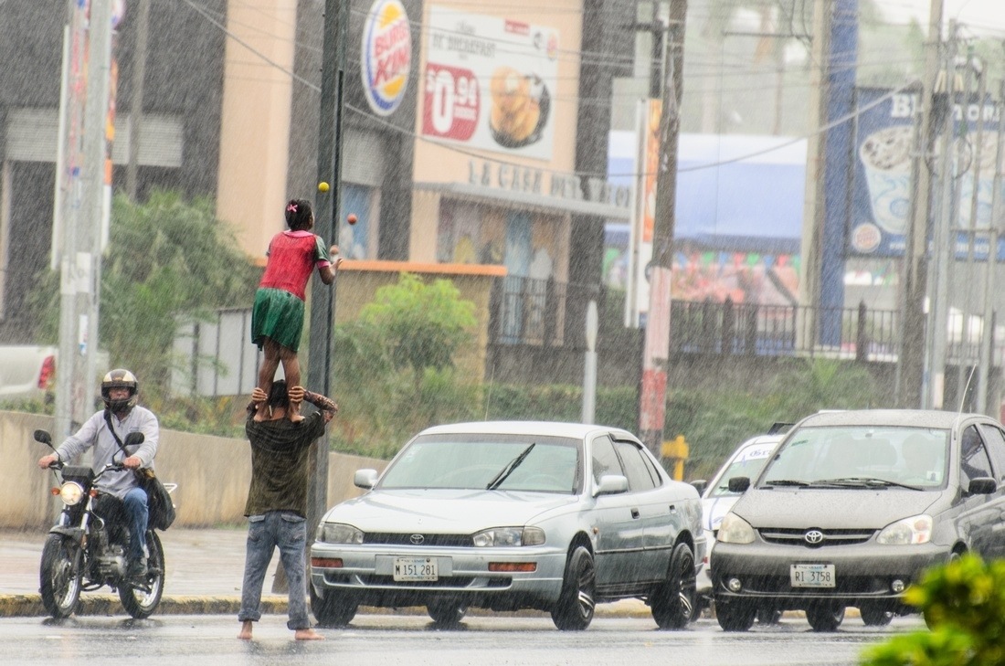 Street jugglers earn money, rain or shine, on an intersection of Managua, Nicaragua. I observed that most people working the street corners on Managua were small entrepreneurs who sold wares or food, offered services such as washing windshields, or showcased their skills or talents.