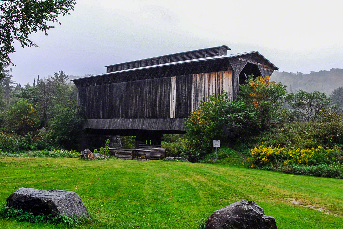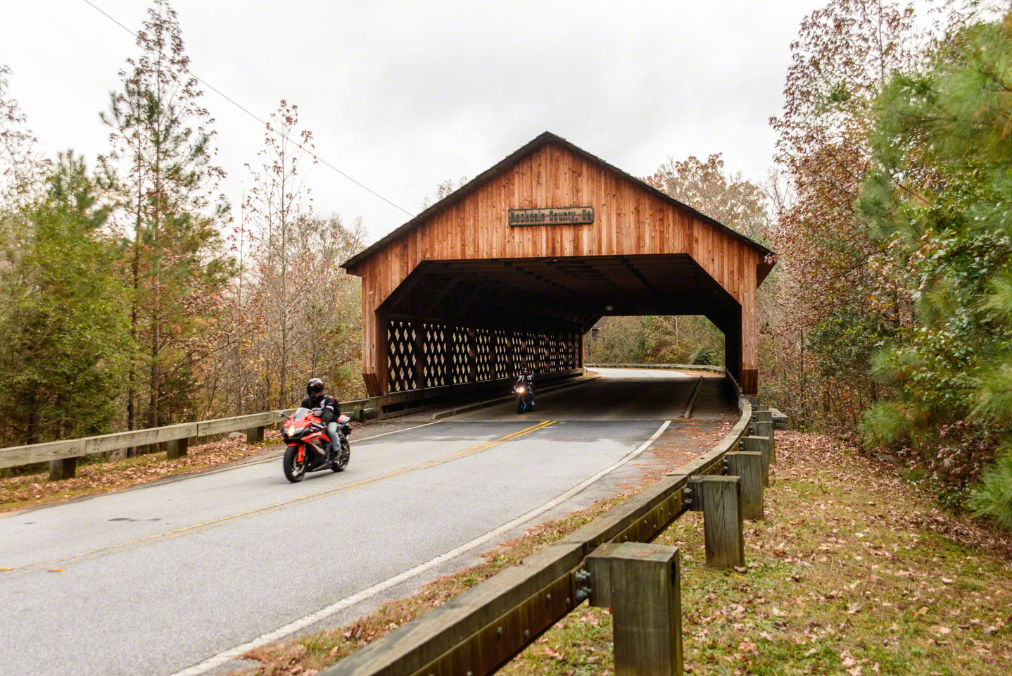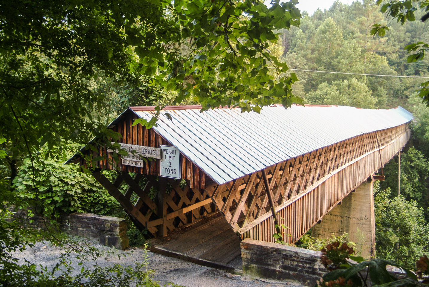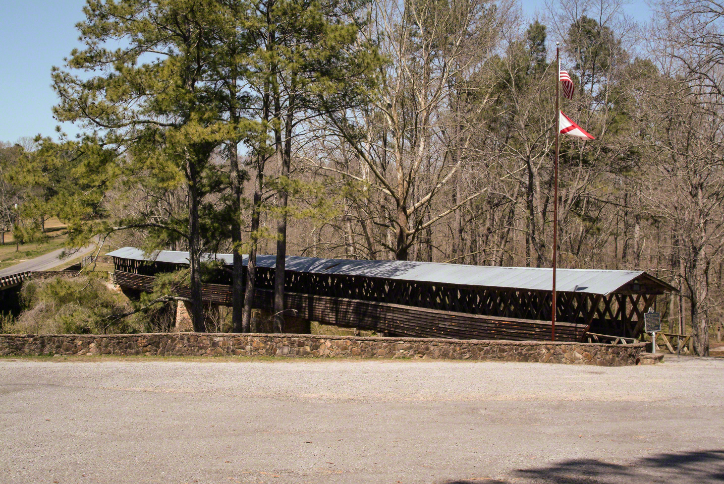 The Kymulga Covered Bridge is a pedestrian bridge spanning the Talladega Creek. The bridge was built in 1861. It is made of wood and corrugated sheet metal, and is 105 feet long.